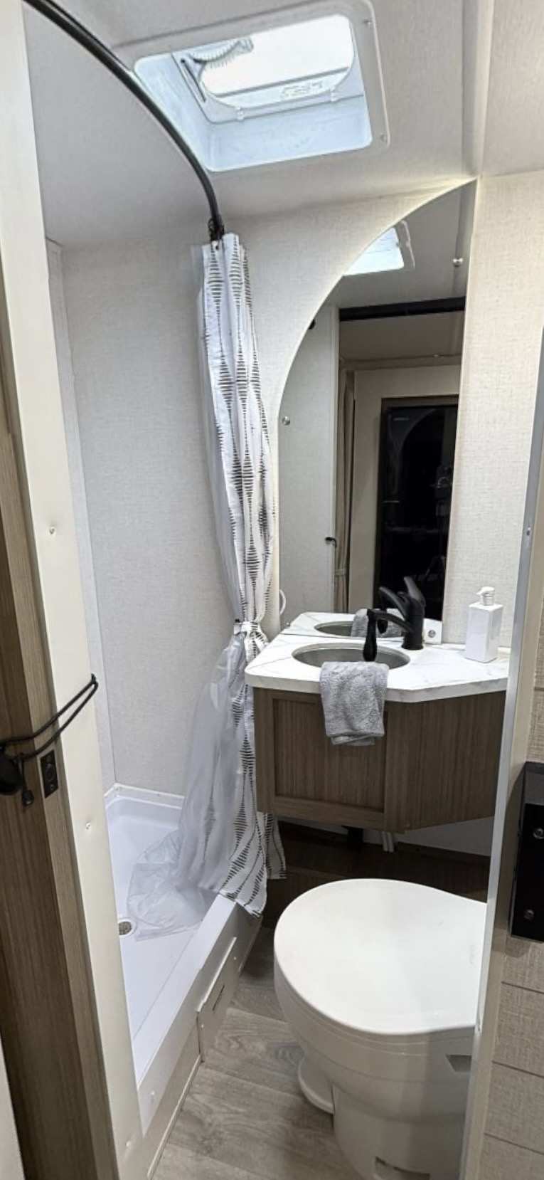 Equipamiento: Aire acondicionado calefacción, agua caliente, cocina a gas, microondas, gran refrigerador y freezer 12V, baño con ducha, lavamanos y wc, dos literas con privacidad, comedor cama y pieza matrimonial privada, Slide out (ampliación lateral), toldo eléctrico, Smart TV 32″, dos paneles solares 170W, dos baterías de ciclo profundo 100Ah, transformador de corriente, conexión a la red de agua, electricidad y alcantarillado.