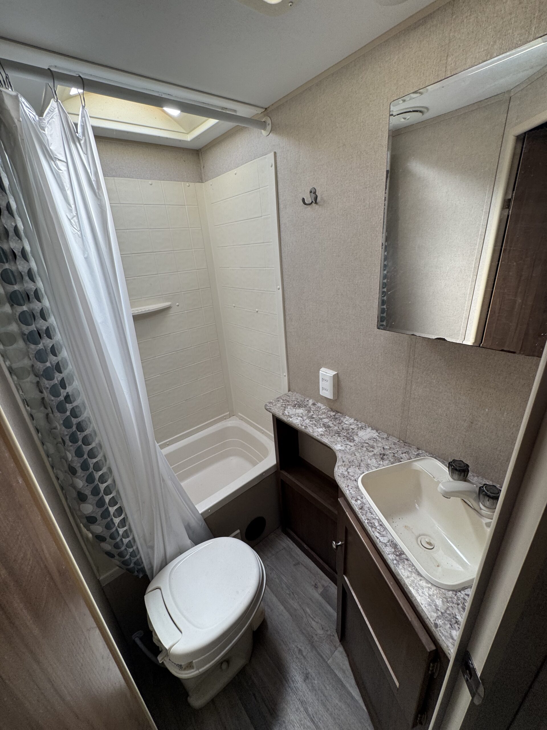 Estanque de agua potable: 180 litros, agua gris: 200 litros, agua negra: 130 litros.