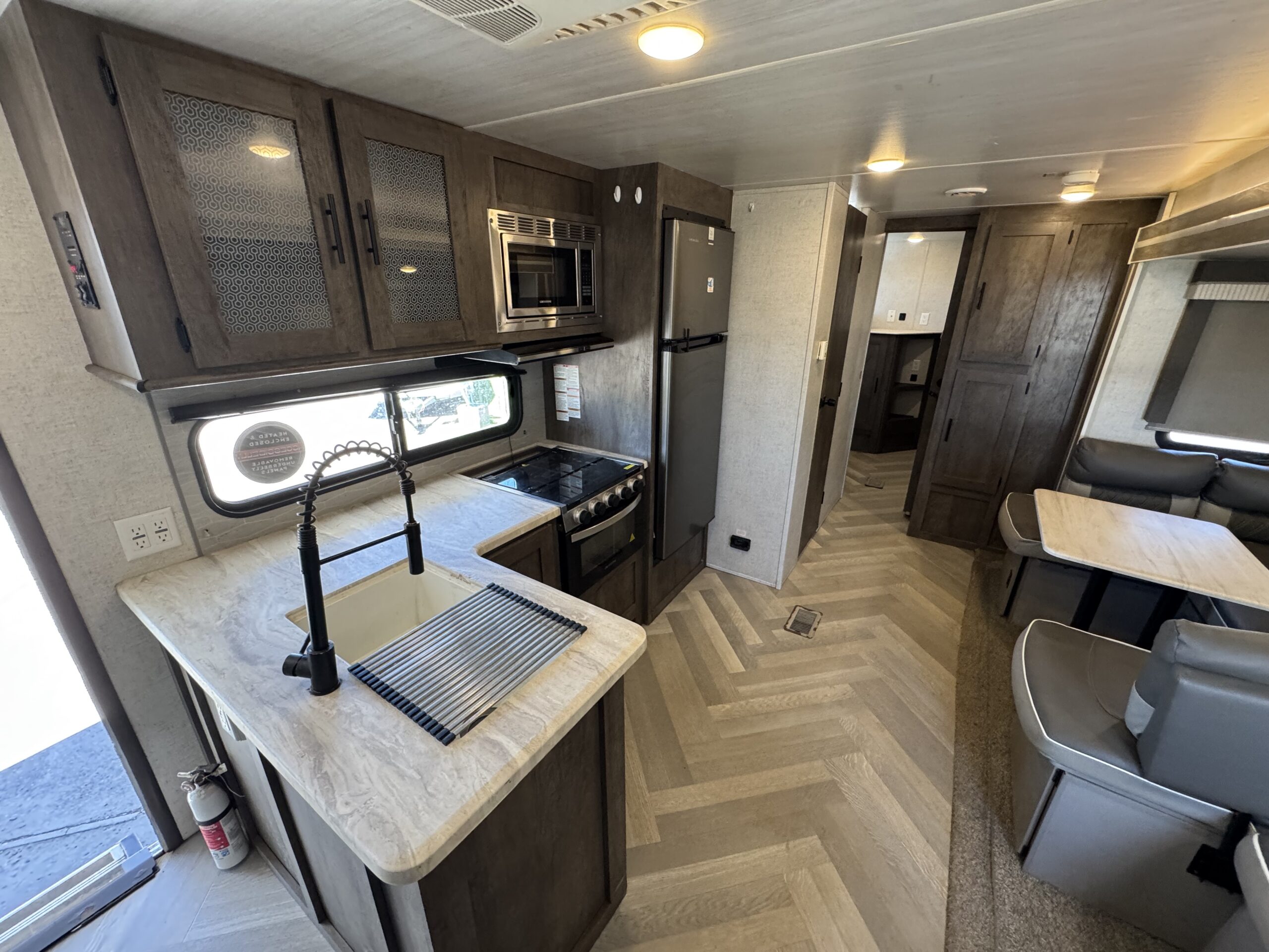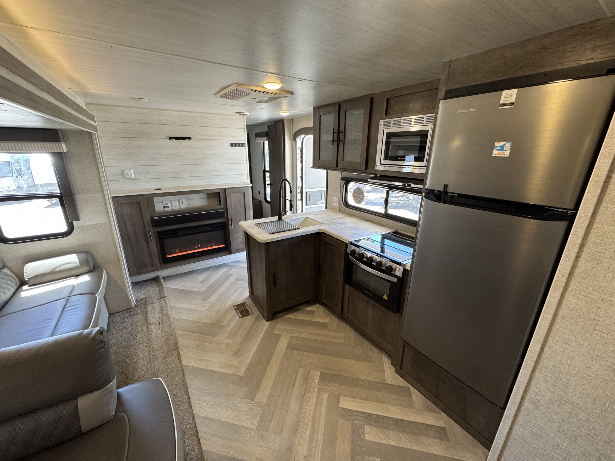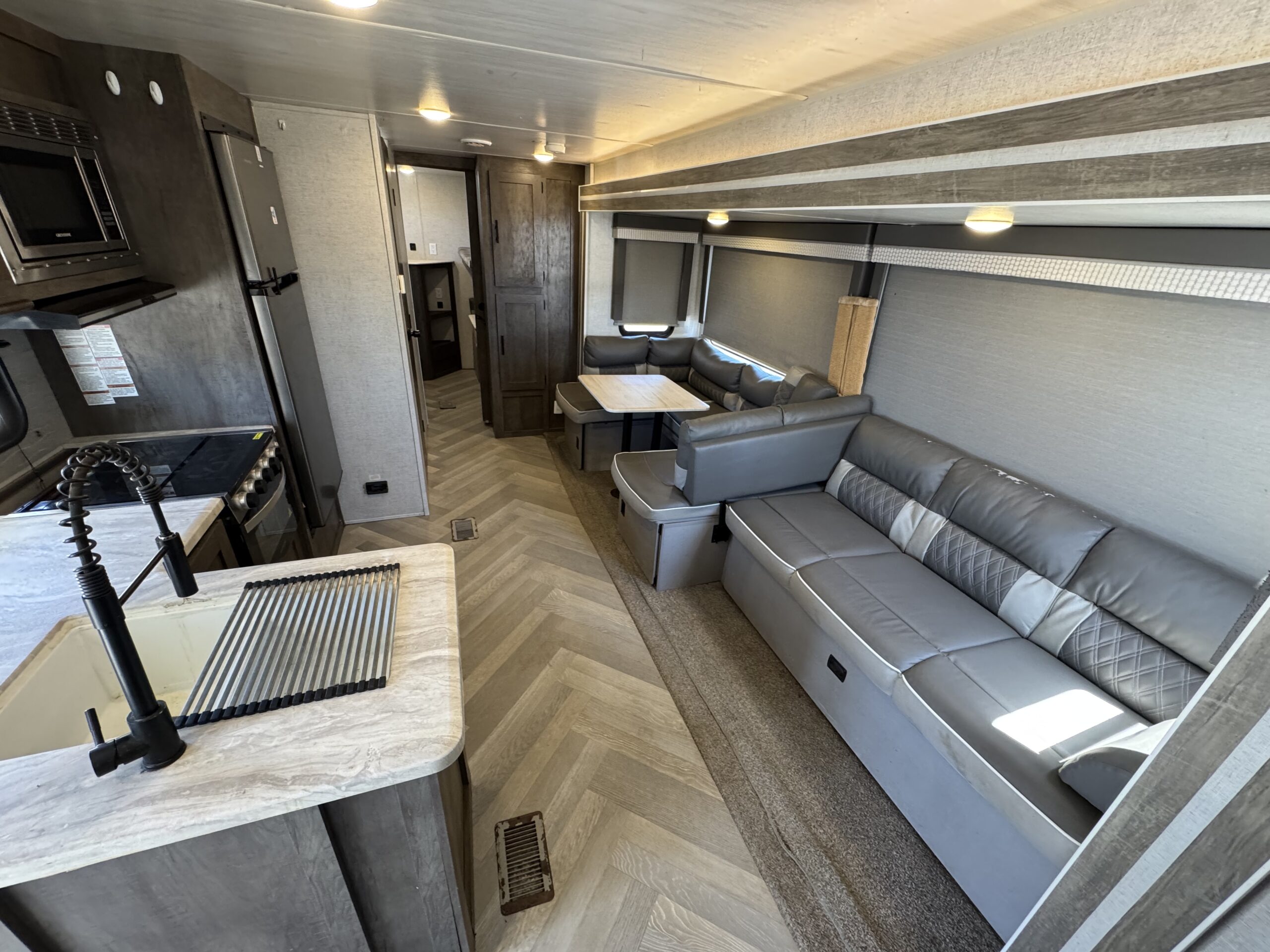 Equipamiento: Aire acondicionado, calefacción, agua caliente, cocina y horno a gas, microondas, refrigerador y freezer 12V, amplio baño con ducha, lavamanos y wc, dos habitaciones independientes, chimenea eléctrica, Slide out (ampliación lateral), parrilla exterior con frigobar, gatas estabilizadoras eléctricas, toldo retráctil eléctrico, Panel solar, batería de gel 100AH, transformador de corriente.