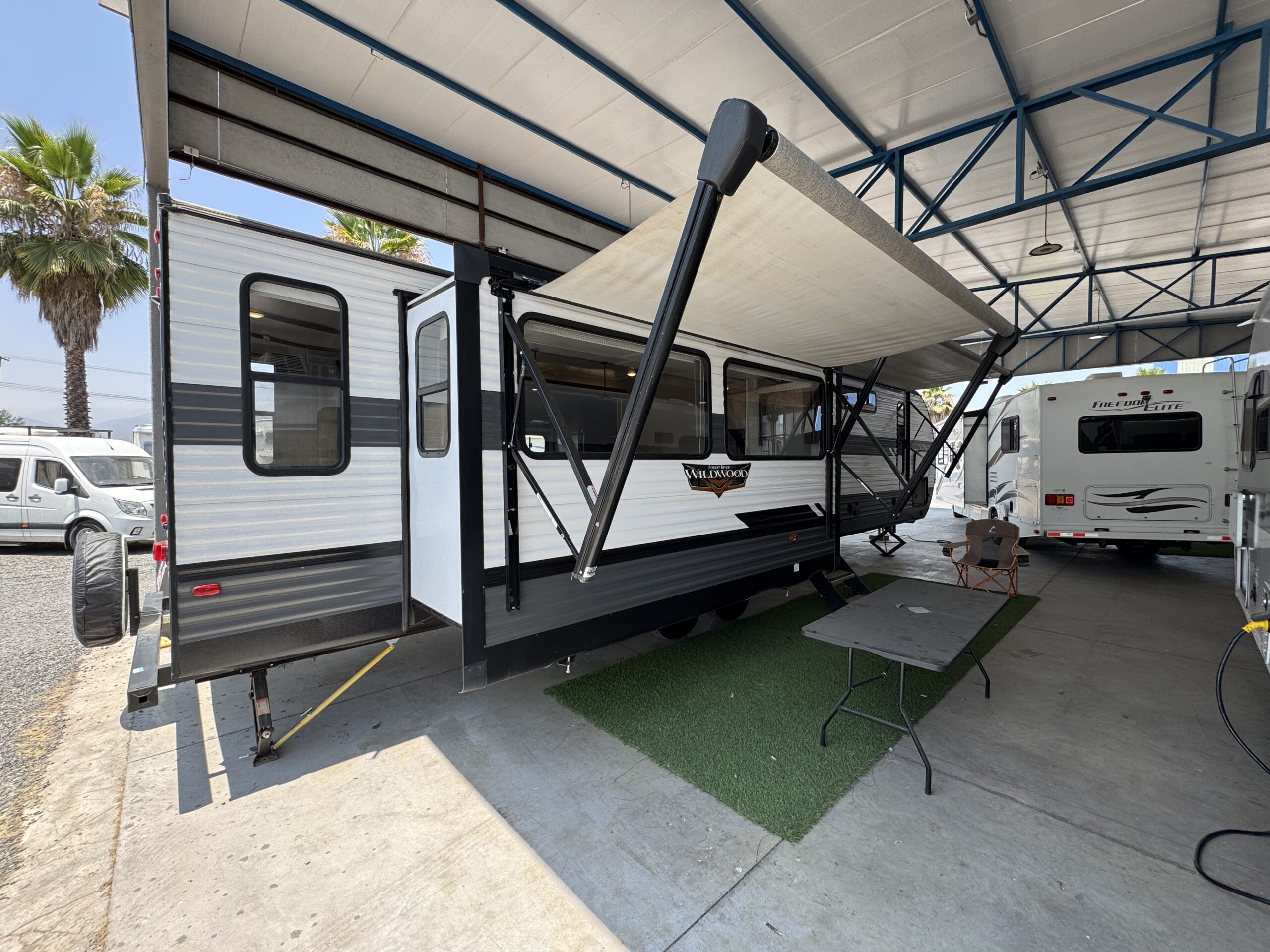 Equipamiento: Climatización, calefacción, agua caliente, refrigerador y freezer 12V, cocina y horno a gas, microondas, amplio comedor que se convierte en cama, sofá cama, sillones tipo berger, chimenea eléctrica, amplio baño con ducha, lavamanos y wc, pieza matrimonial privada y pieza secundaria, dos toldos eléctricos, amplia bodega exterior, dos paneles solares de 200W, dos baterías de gel nuevas, transformador de corriente.