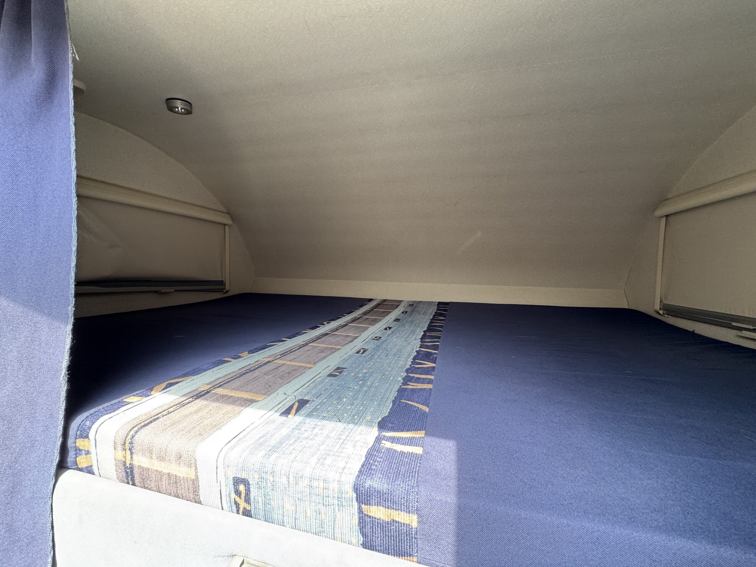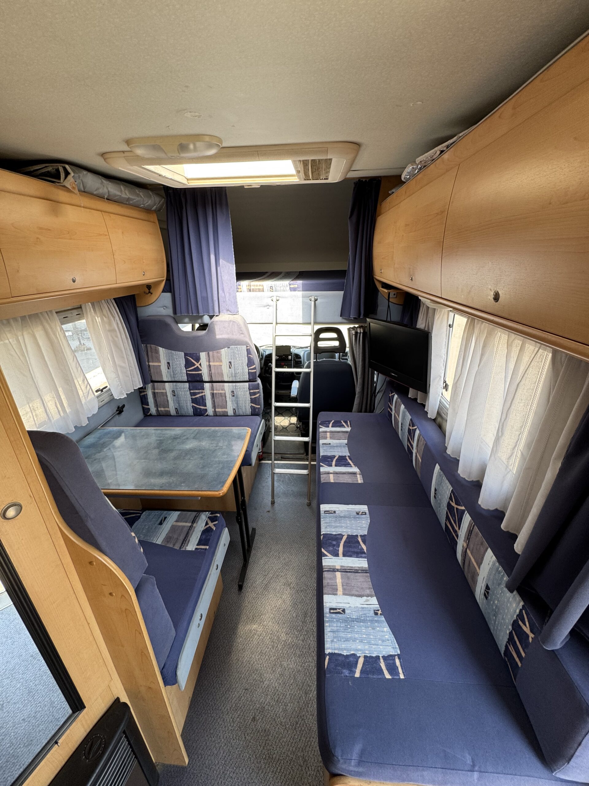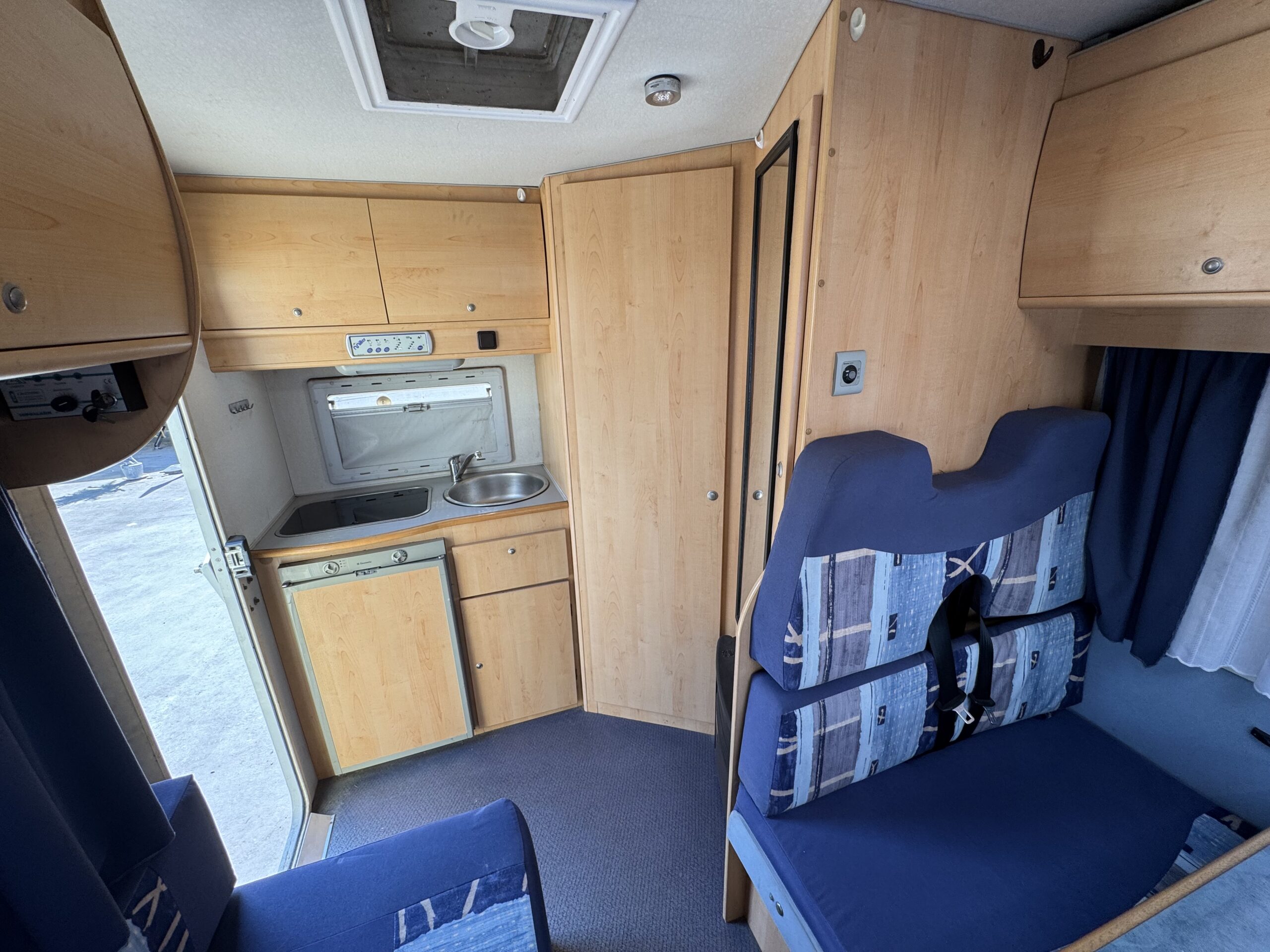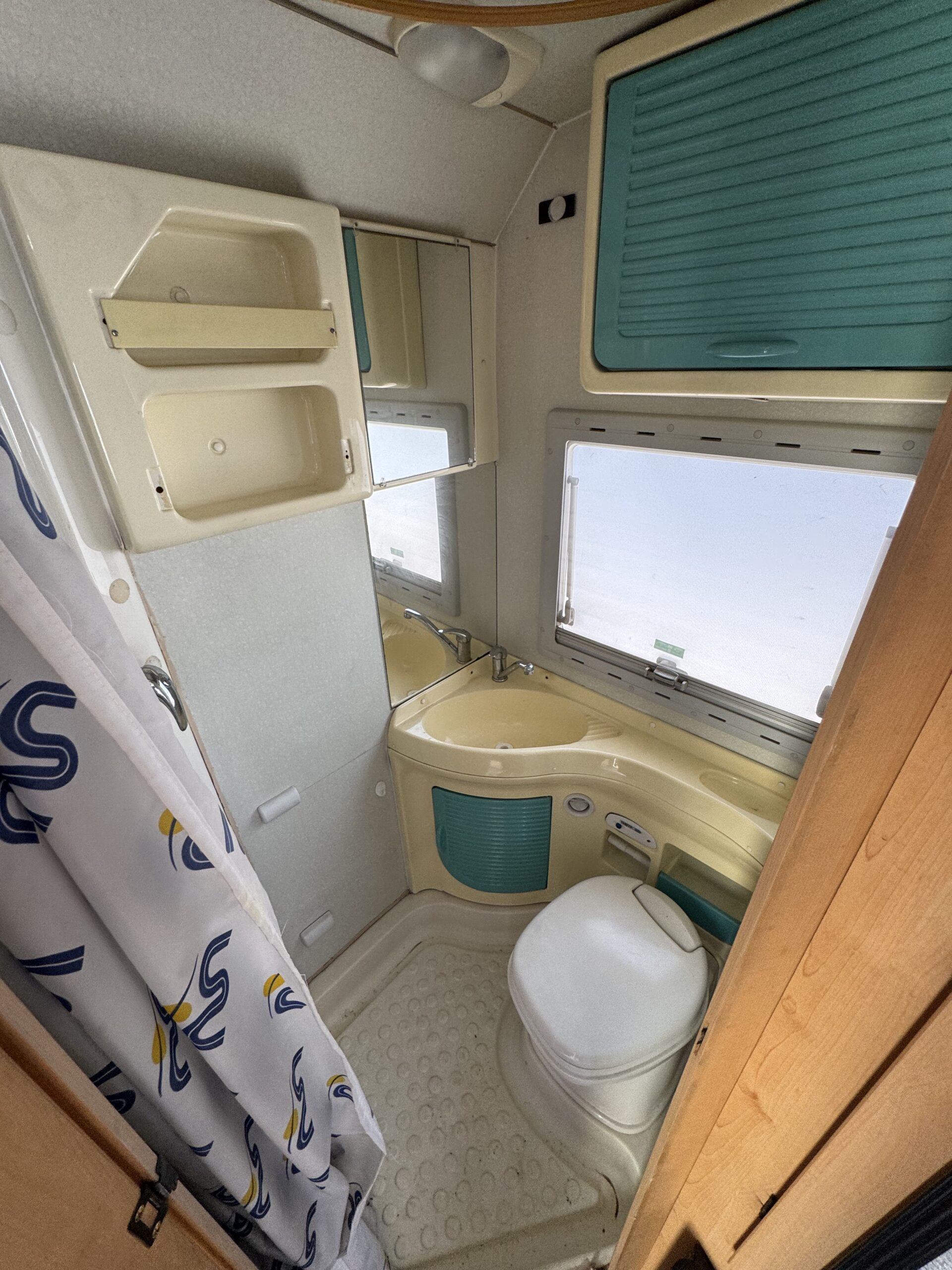 Equipamiento: Calefacción, agua caliente, refrigerador trivalente (12v, 220v o gas), cocina a gas, lavaplatos, amplio baño con ducha lavamanos y wc, Tv, batería, panel solar, conexión a red 220V, toldo retráctil manual.