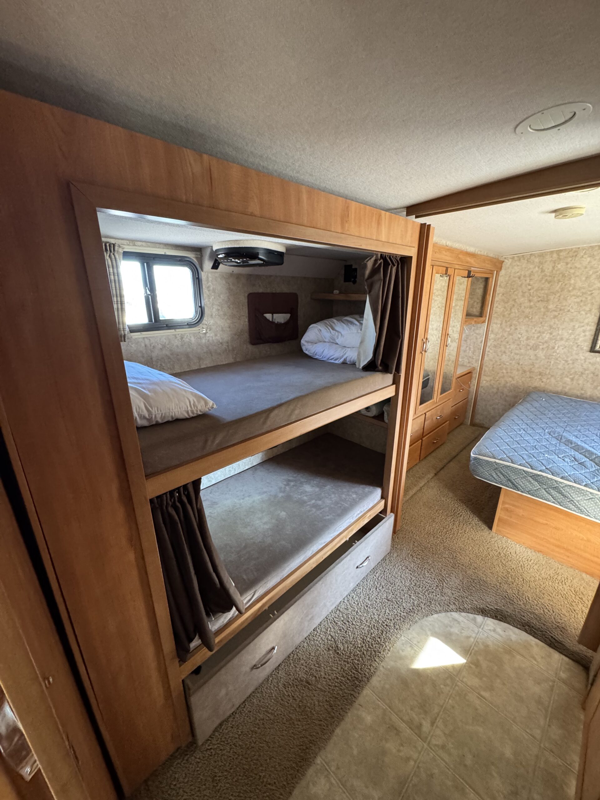 Equipamiento: aire acondicionado, calefacción, agua caliente, cocina y horno a gas, refrigerador y freezer, amplio baño con ducha, lavamanos y wc, dos slide out (ampliaciones laterales), pieza matrimonial privada, generador de corriente 4000W, estabilizadores hidráulicos, transformador de corriente.